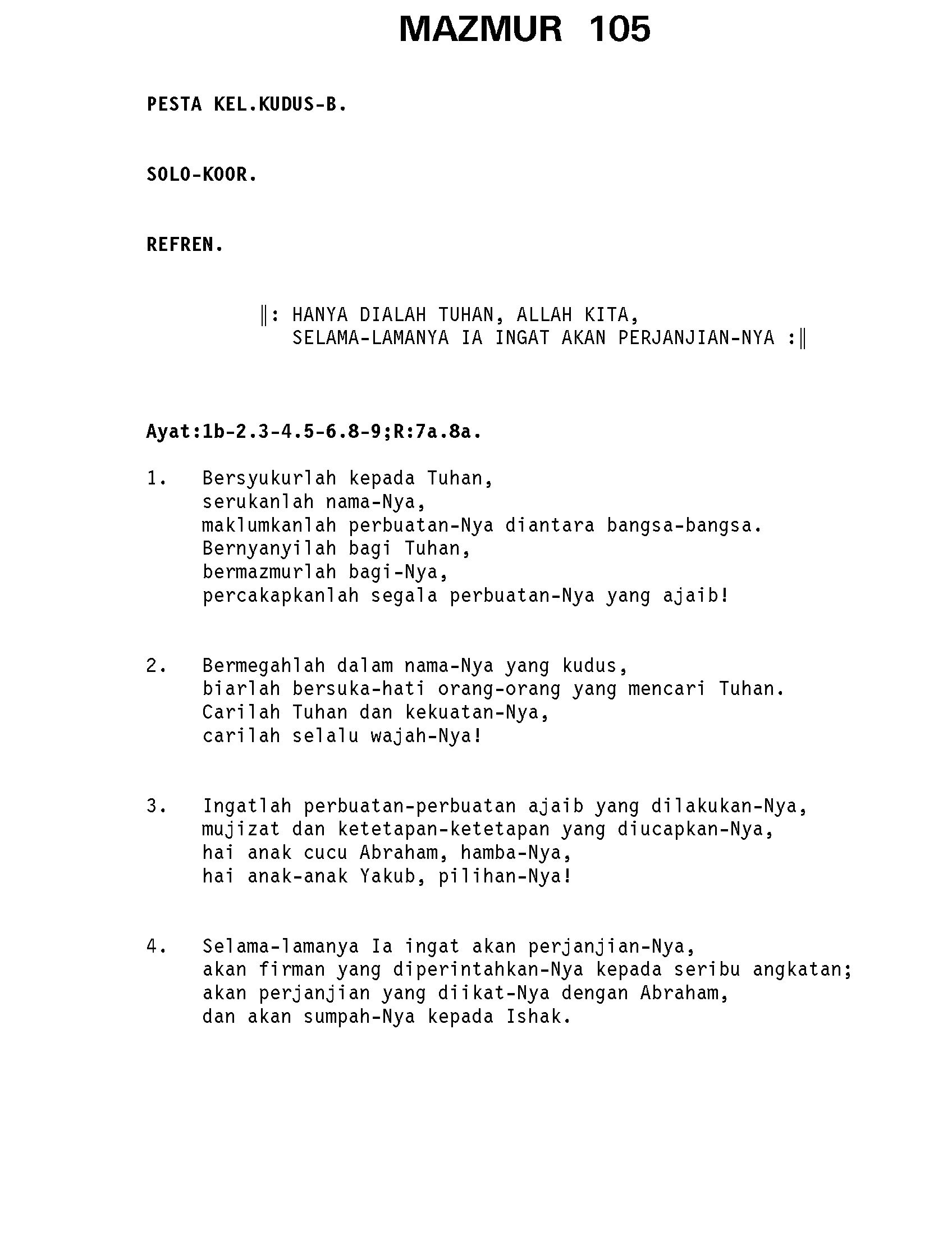 GATHER B. HAL. 27 Kumpulan Nyanyian MAZMUR B YouTube Link REFREN. HANYA DIALAH TUHAN ALLAH KITA SELAMA LAMANYA DIA INGAT AKAN PERJANJIANN…